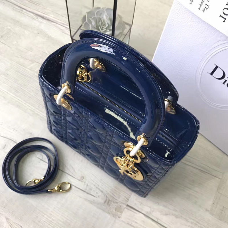Dior迪奥 Lady Dior 经典戴妃包 五格小号 蓝色漆皮 金色五金