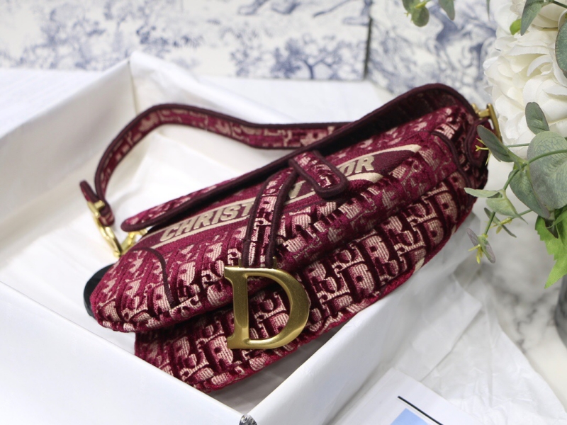 M0446 Dior Saddle马鞍包 Dior Oblique 绣花丝绒 酒红色