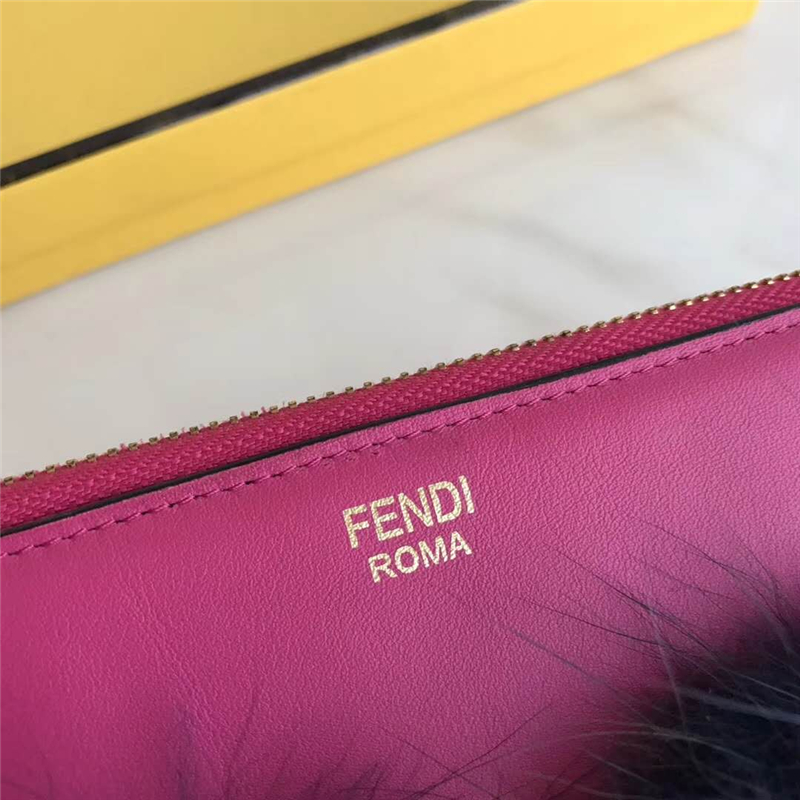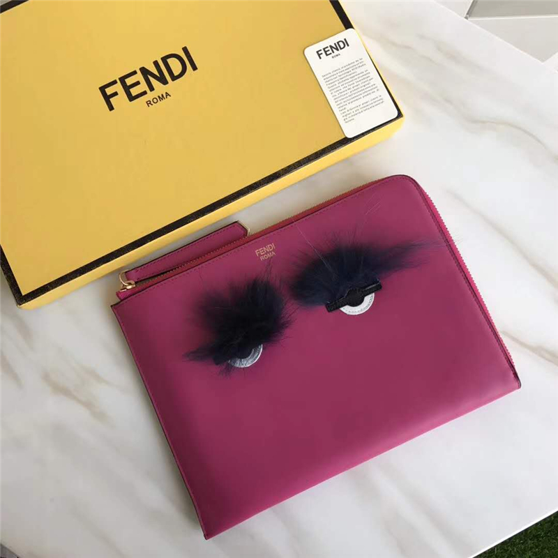 0363 FENDI 芬迪 柔软小牛皮 毛绒眼睛 拉链手拿包 玫红色