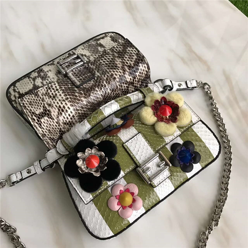 8765C FENDI DOUBLE MICRO BAGUETTE 水蛇皮蟒蛇皮 花朵装饰 绿配白