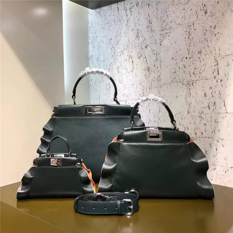 FENDI 芬迪 8773 2107时装秀款 波纹荷叶边 小牛皮拼色 单肩手提包 墨绿色