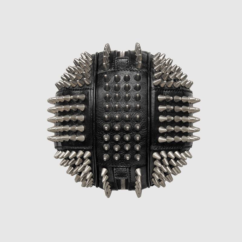 皮革配饰系列向体育界致意,不同凡响的设计灵感汲取自体育运动。配有两个皮革提手、一条可拆卸肩带和拉链扣,球形构造使人不禁联想到篮球外形。满饰银色调尖钉,呼应2019早春时装秀中透露出的80年代华丽摇滚和朋克风潮,而秀场舞台就搭建在法国阿尔勒小镇古老的阿利斯康(Alyscamps)陵园中。
