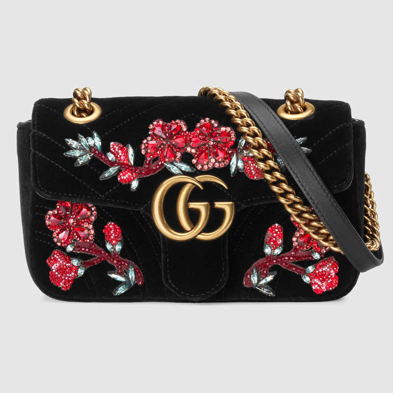 446744 GUCCI GG Marmont系列 刺绣 人形花纹天鹅绒 迷你手袋 黑色