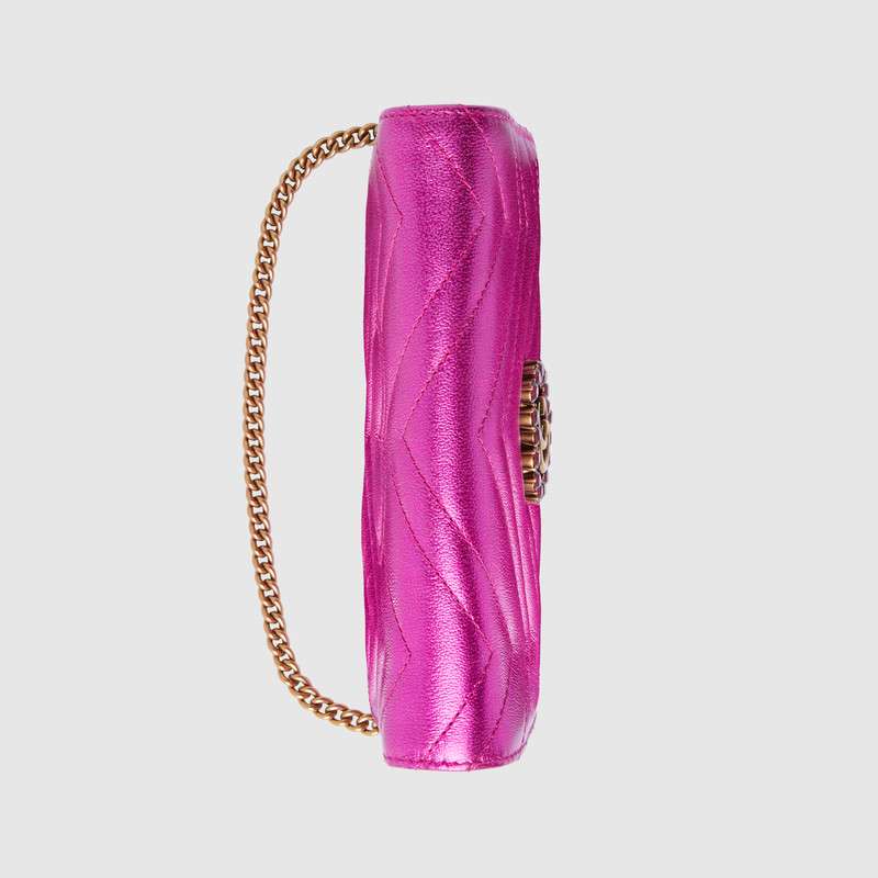 献礼情人节,这款情人节特别款迷你手袋上饰有双G细节,并以红色水晶环绕,勾勒出心形图案。金属质感绗缝皮革材质,配以V型设计。