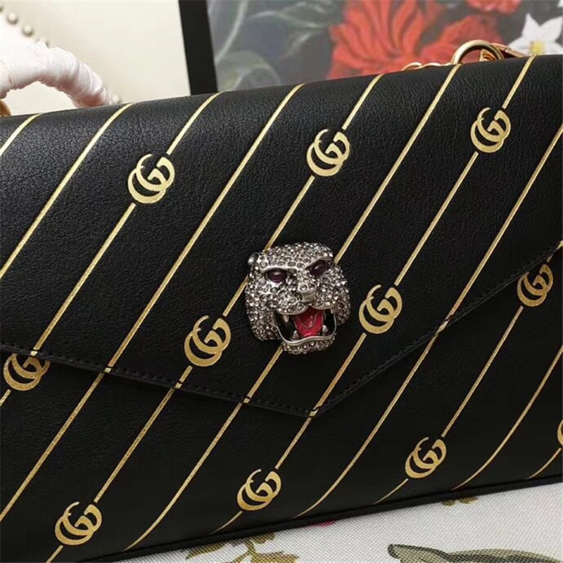 524822 采用新颖时尚的双袋设计,正反两种造型,让服饰搭配更有新意,更多变化。一面是作为品牌标志的经典双G配件,饰有咆哮的猫科动物头像,头像绘饰彩色珐琅,镶嵌闪光水晶,9612两颗宝石充当眼睛。