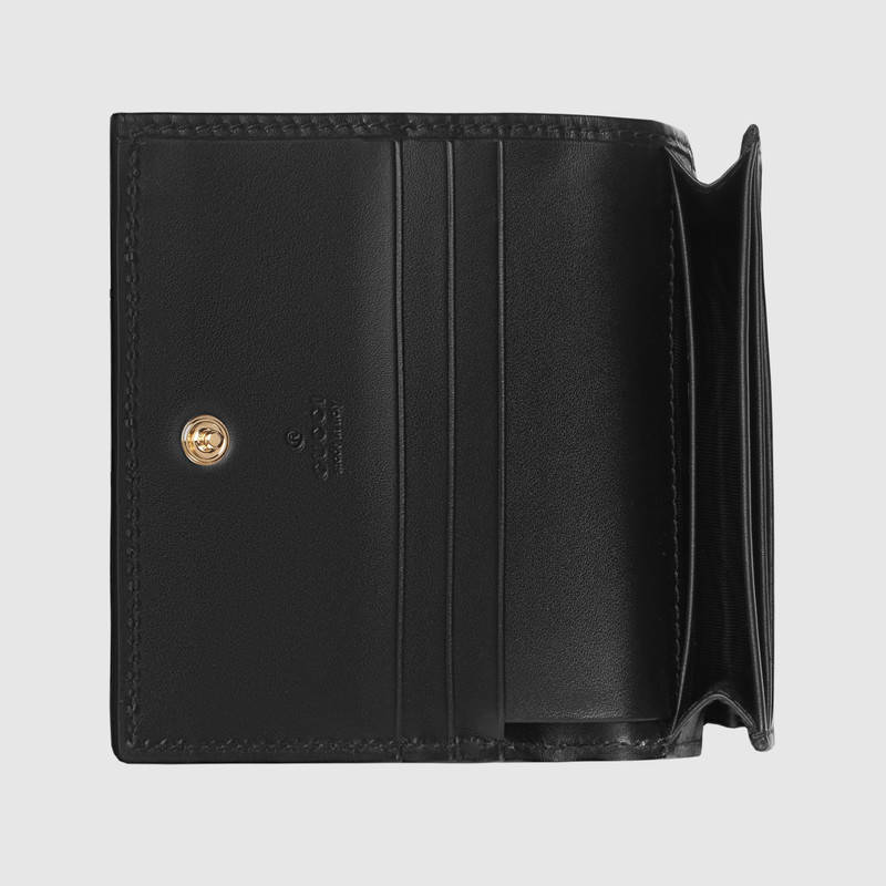 精致时尚的卡片夹,配有钞票隔层、侧袋、四个卡片隔层和翻盖口袋。采用热压Gucci Signature真皮精制而成,印花纹理坚实。