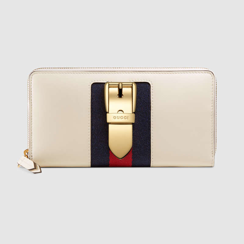 476083 GUCCI Sylvie 系列 皮革 蓝红尼龙织带拼皮 全拉链式皮夹 白色