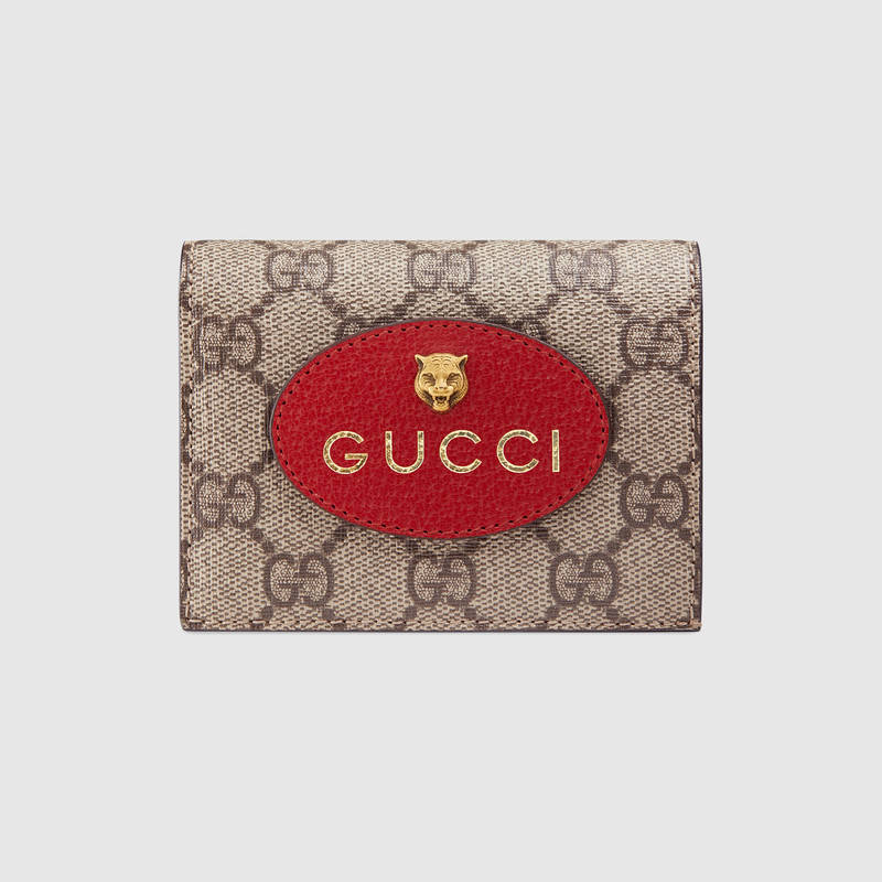 芙蓉红皮革虎头标签,正面压印金色Gucci,此标签旨在向复古行李细节致敬。卡片夹采用GG Supreme高级人造帆布精制而成,材料可分解。