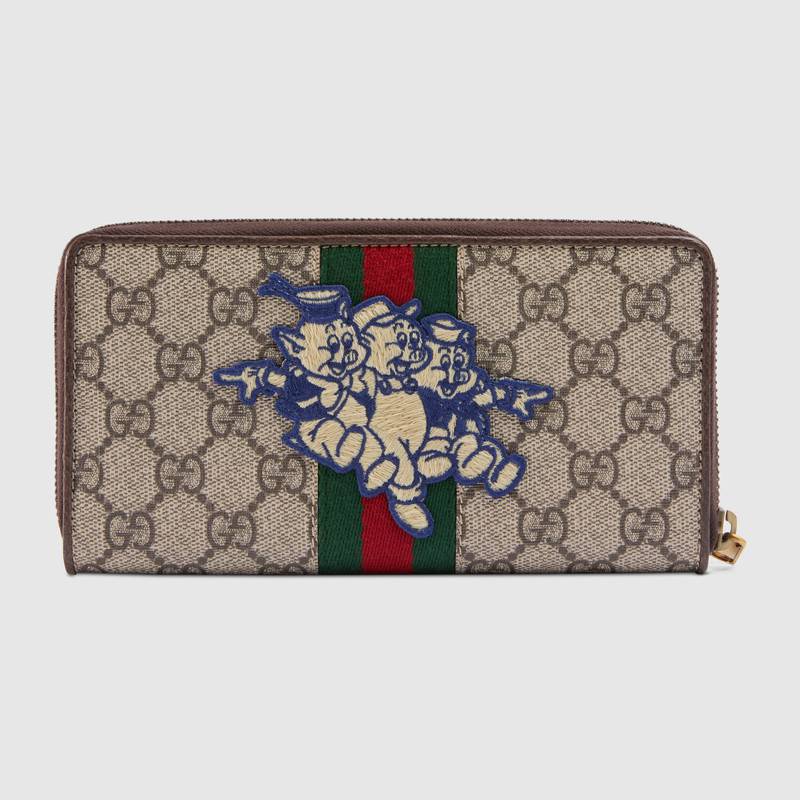 557696 GUCCI GG Supreme高级人造帆布 三只小猪图案 全拉链钱包 乌木色