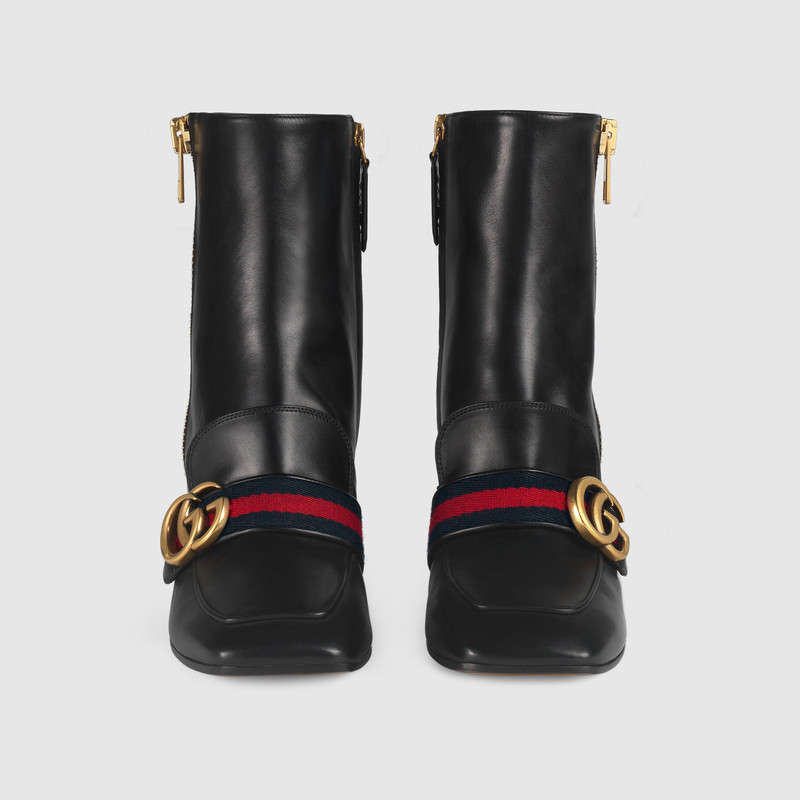 古董金色调双G装饰于这些中跟真皮及踝靴上的蓝/红/蓝web织带 上。方头,有精致的鞋跟和侧面拉链开合