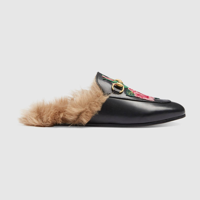此款Princetown系列拖鞋全部加衬,配以羊毛滚边,装饰品牌标志性的马衔扣细节。两只拖鞋正面均装饰花朵贴花。