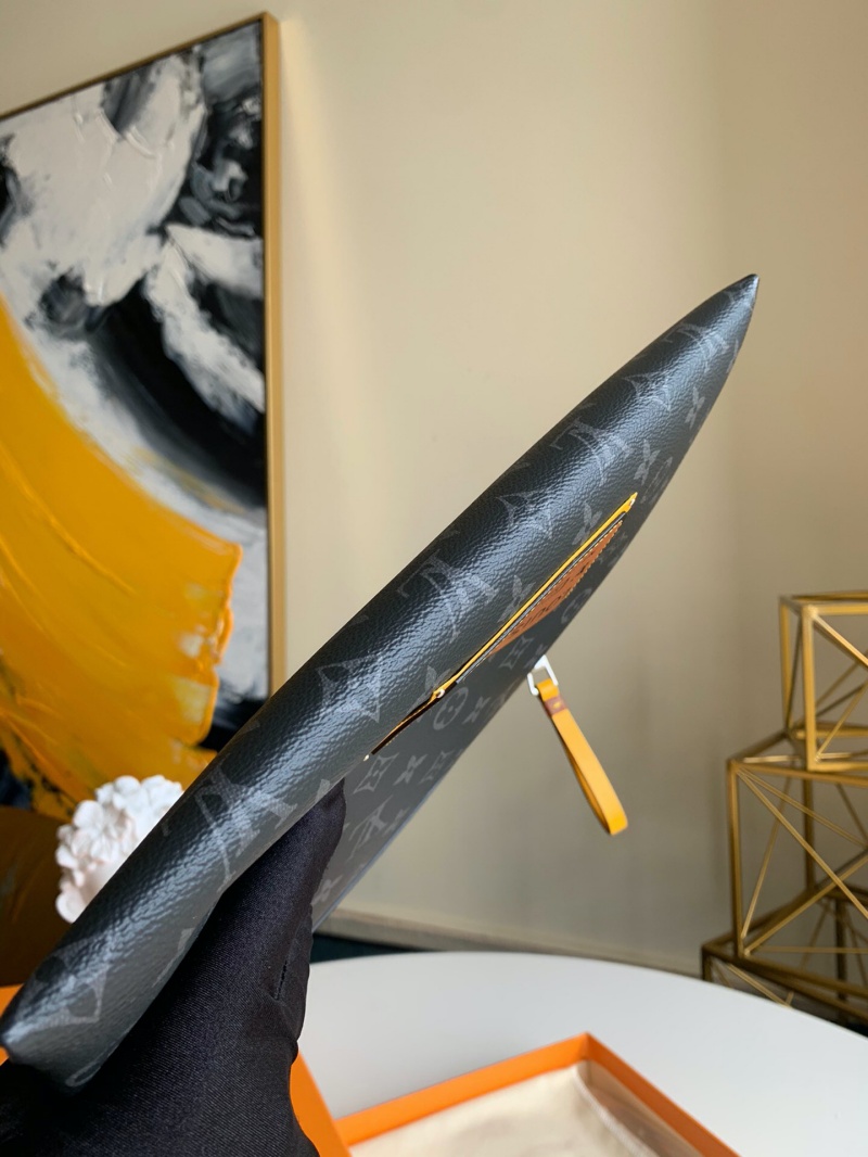 Pochette Discovery 大号手袋是时尚宽敞的旅行手袋,可安全收纳报纸、文件和其他用品。属于 Gaston Labels 限量版系列,由 Monogram Eclipse 涂层帆布制成,其压纹皮革标签借鉴路易威登之孙 Gaston-Louis Vuitton 收藏的复古行李标签设计。