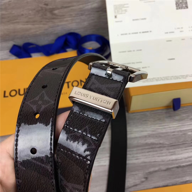 LOUIS VUITTON 重点作品之一,男女通用腰带 老鼠货 宽度30毫米 编码MP056 经典的帆布气息注入小牛皮 经特别处理塑造出滑亮的全镜面效果 全新针扣设计 腰带扣环上刻有英文字样