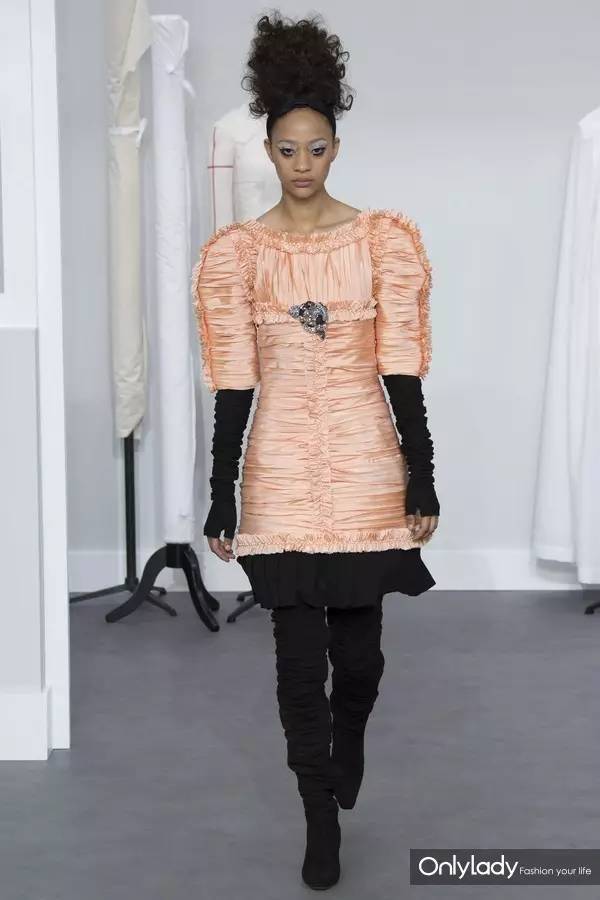 本次秀场变手工坊的概念可谓用心良苦,老佛爷意图将成衣的制作流程全部公开,让观者全方位体验Chanel华服的诞生过程,从而向专注勤奋的手工艺人致敬。至于造型,本次高定系列的一大亮点是斜纹软呢套装,在日装的角色中具有举足轻重的地位。
