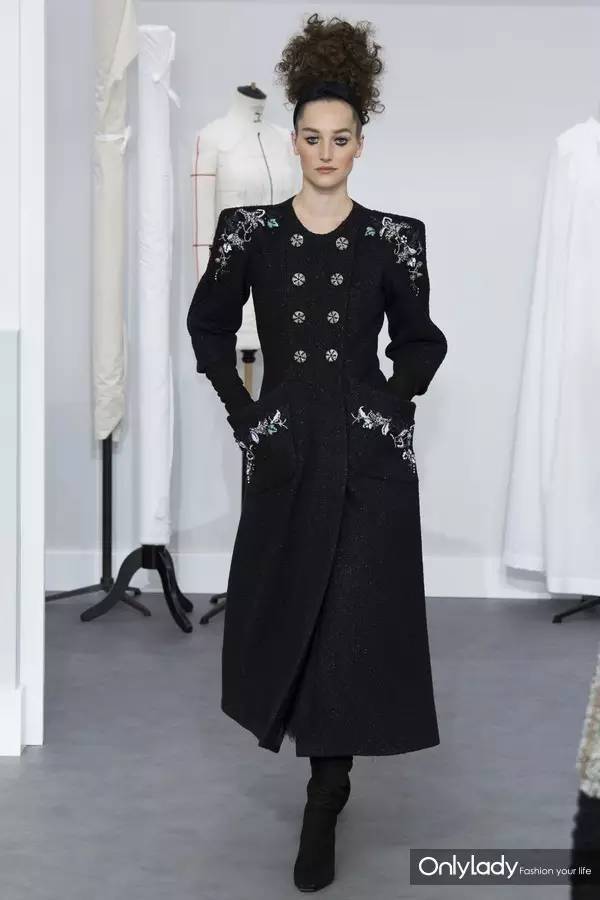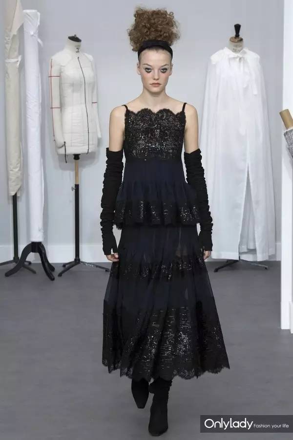 作为高级定制服装的核心,这一季的晚装沿袭了黑色、白色与银色的经典组合,长款的晚礼服裙,以略带银线的黑色花织斜纹软呢,搭配大量的羽毛装饰,隆重高贵。