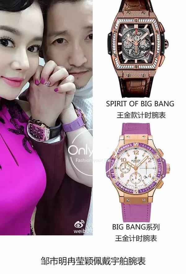 邹市明自从带着儿子轩轩参加《爸爸去哪儿第三季》后,儿子的人气攀升得比老爸还高,尽管儿子人气超高,但胖轩的妈妈冉莹颖才是邹市明炫全家的首要法宝。大年三十,世界冠军邹市明与妻子冉莹颖一起参加春晚,在后台就玩儿起了炫全家的游戏。这对夫妻在春晚后台佩戴着宇舶的Sririt Of Big Bang腕表和Big Bang系列女款王金腕表。王金是宇舶独有的一种专利金质材料,材质为95%黄金混合5%铂金,色泽要比玫瑰金稍淡一些。