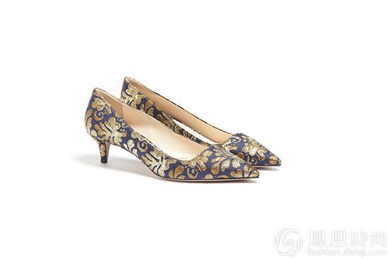 华丽的金银丝织锦面料也被运用在Prada低跟尖头鞋的设计中,对那些偏爱简洁造型又不愿落入平庸的时髦人士来说,这么一双华丽复古尖头鞋绝对值得拥有。